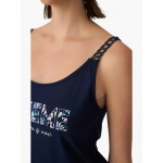 Μπλουζάκι τοπ σε χρώμα μαρίν με εντυπωσιακές τιράντες και ανεξίτηλο τύπωμα.