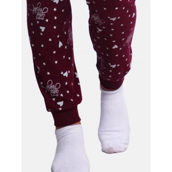 Παντελόνι εμπριμέ σε μπορντώ χρώμα με μπάσκα στο κάτω μέρος και μαλακό λάστιχο.